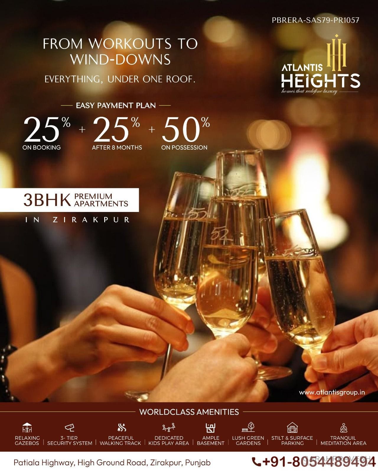 | Atlantis Heights | 3BHK | High Ground Road | 25% Now, 25% in 8 Months, 50% on Possession | Spacious flats, Dual Core towers |