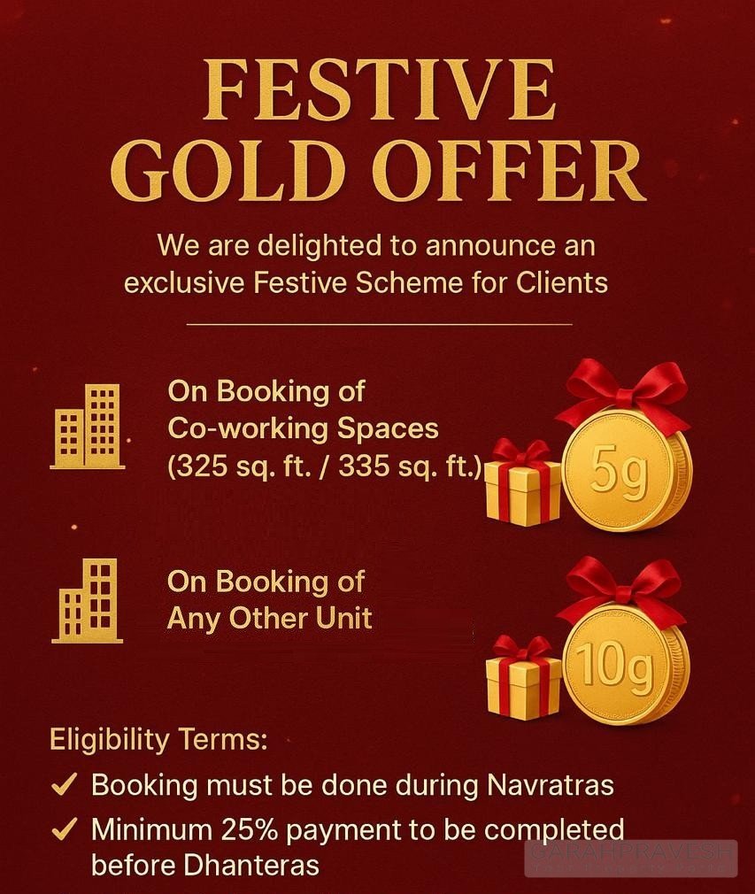 Business meets prosperity! Book co-working spaces (325–335 sq.ft.) and get 5g gold, or any other commercial unit for 10g gold. Valid only during Navratri/25% Dhanteras advance.
