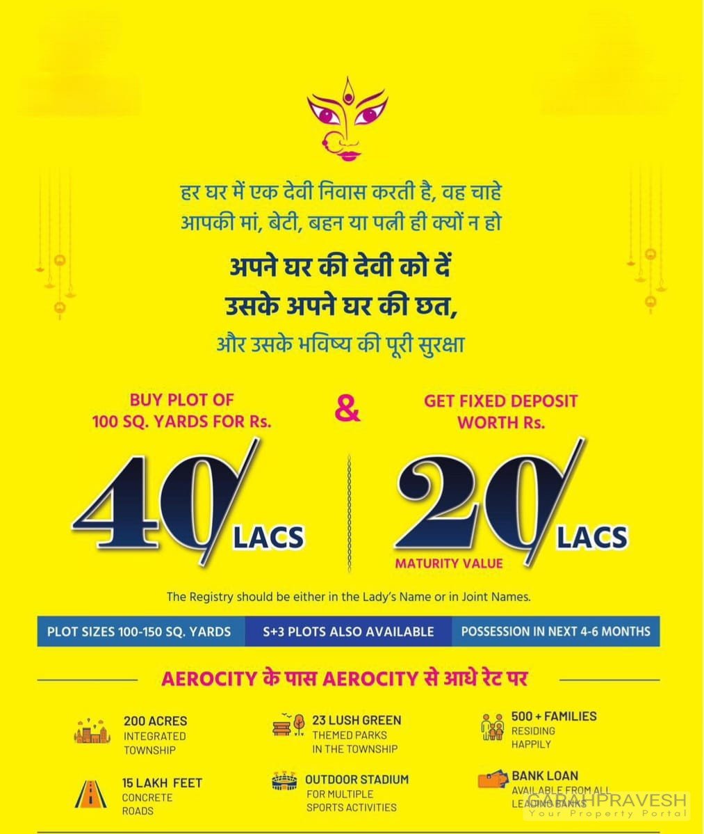Make her dream, your legacy! Buy a 100-sq-yard plot near Aerocity for just 40 lacs and receive a fixed deposit worth 20 lacs (on maturity) for her future security. Registries in a lady’s or joint name only.