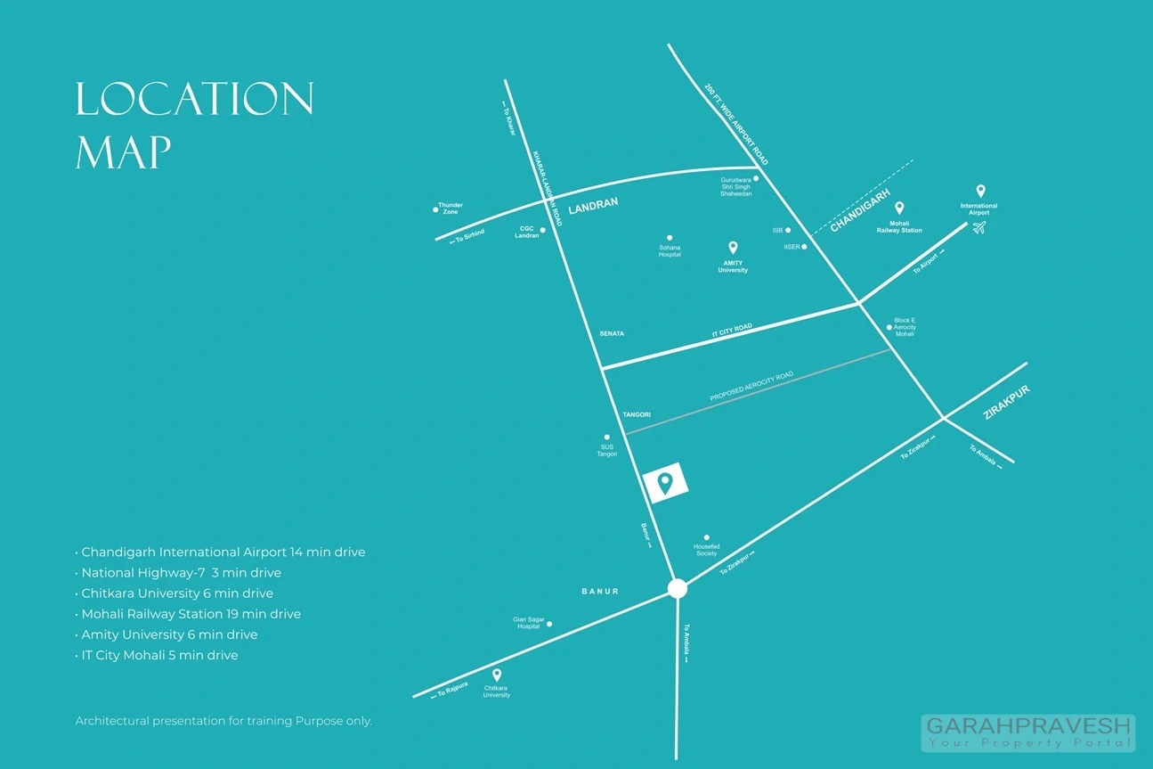 The project enjoys excellent connectivity to Chandigarh, Airport Road, IT hubs, schools, hospitals, and major highways.