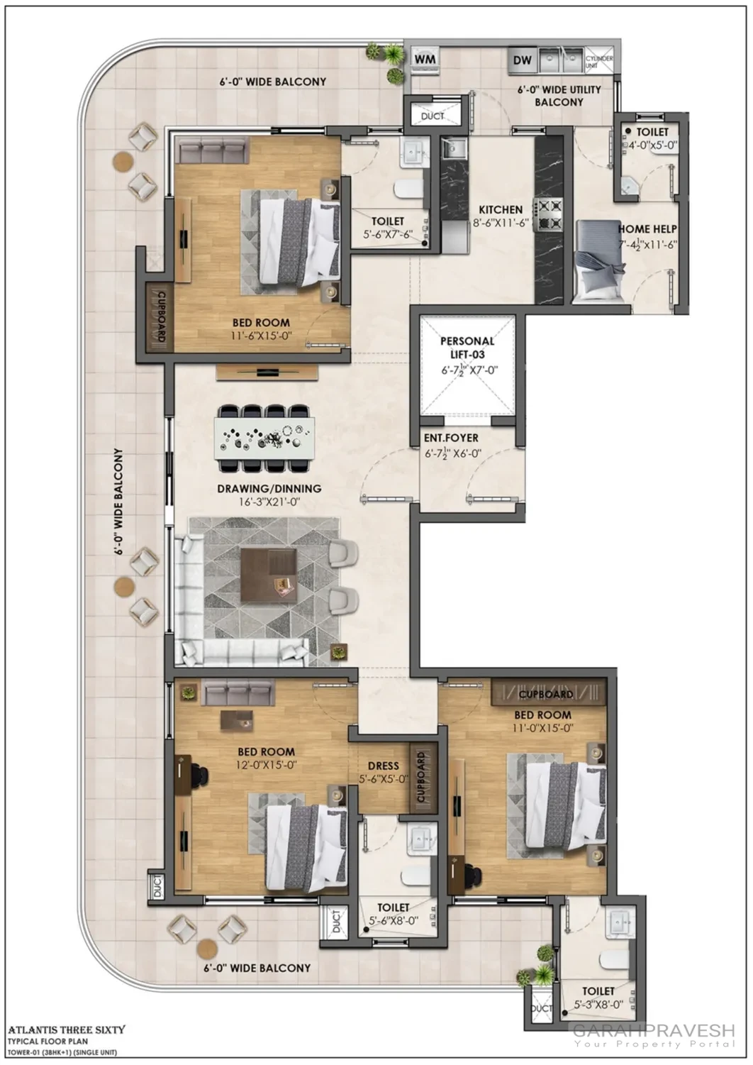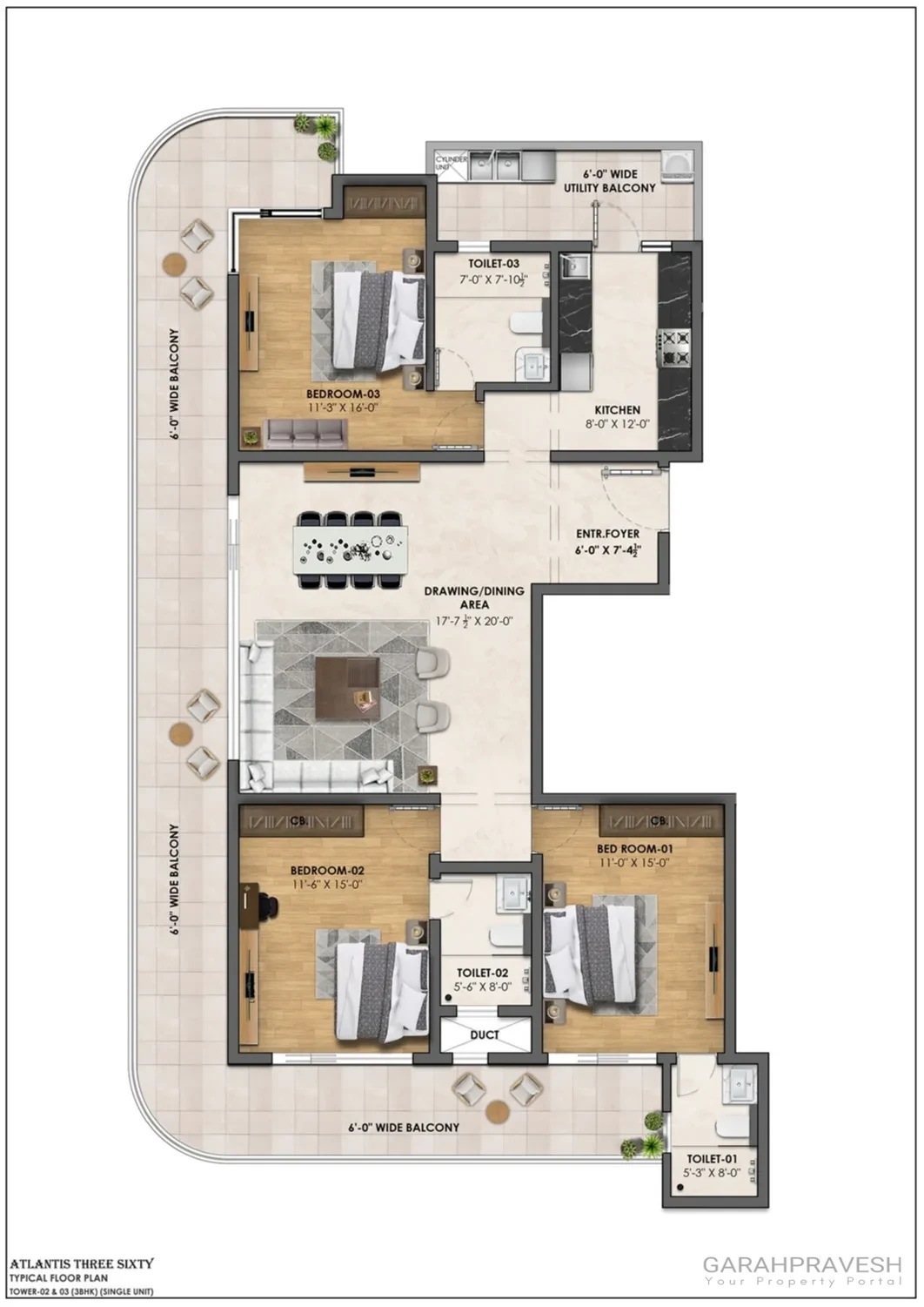 3BHK luxury apartments for sale in Atlantis Three Sixty, Airport Road Zirakpur near Chandigarh – spacious Mivan construction flats with premium amenities and modern living by Krishna Builders, available through Garah Pravesh 7087949434.